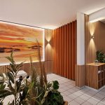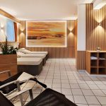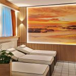 Ein besonderes Highlight bildet die groĂflĂ€chige Tapete mit indirekt beleuchtetem Strandmotiv, die sofort Urlaubsstimmung aufkommen lĂ€sst und als stimmungsvoller Blickfang dient.