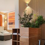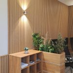 Um eine ruhige, warme AtmosphĂ€re zu schaffen, wurden die kahlen WĂ€nde mit Akustikpaneelen aus Holz und Filz verkleidet. Sie verleihen dem Raum nicht nur eine natĂŒrliche, wohnliche Optik, sondern verbessern auch spĂŒrbar die Raumakustik â fĂŒr mehr Ruhe und Entspannung.