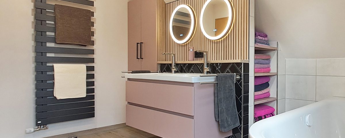 Auch unter dem Dach kann ein Wohlfühlbad entstehen. Das sehr in die Jahre gekommene Badezimmer erstrahlt nun in neuem Glanz und überzeugt durch sein ausgefeiltes Raumkonzept, das eine zusätzliche Dusche ermöglichte. Die geschickt platzierte Badewannen-Vormauerung ist mit den schwarzen Fliesen und der beleuchteten Nische ein echtes Highlight.