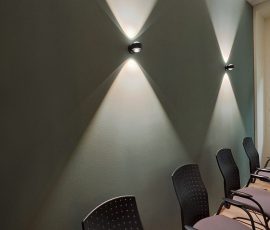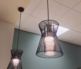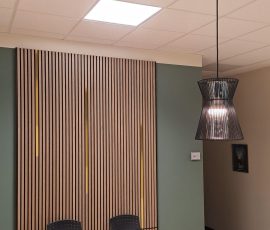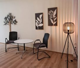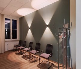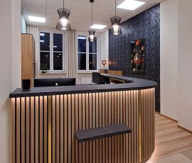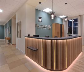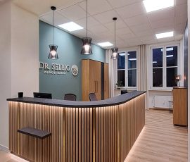 Auch die Formensprache wurde bewusst aufgegriffen und findet sich in der geschwungenen Empfangstheke wieder, die die Patienten gekonnt willkommen heißt und zugleich eine weiche Abgrenzung zum Personalbereich schafft. Ergänzt wird das Konzept durch eine harmonische Beleuchtung, die die runde Thekenform indirekt betont, das Schwarz der Gestaltung aufgreift und die Feinheit der Streifen wirkungsvoll unterstreicht.