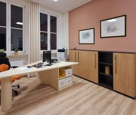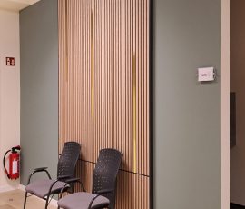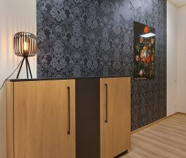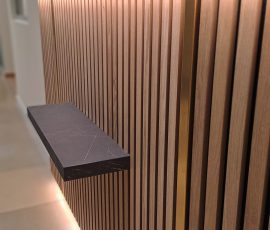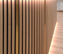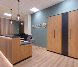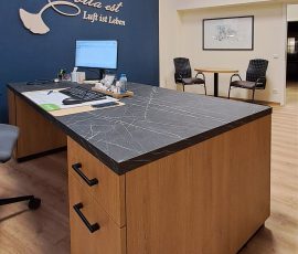 Ziel war es, eine Gestaltung zu entwickeln, die fein, sachlich und zugleich einladend wirkt, das neue Firmen-CI widerspiegelt und die fachliche Kompetenz der Praxis optisch unterstreicht. Die ausgewählten Materialien verleihen der Praxis genau diesen Charakter: warmes, feingestreiftes Holz mit dunklen Absetzungen in Kombination mit Metallapplikationen in Gold.
