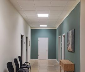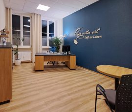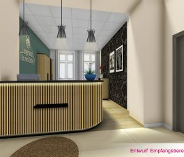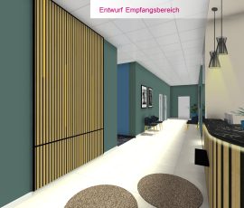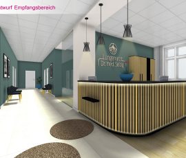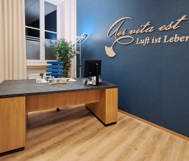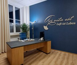 Die Lungenarztpraxis von Dr. Dirk Selbig musste in Ansbach umziehen. Für die neuen Räumlichkeiten wurde ein Gestaltungskonzept benötigt. Der vorhandene Fliesenboden musste erhalten bleiben, da dieser unter Denkmalschutz steht. Das Corporate Identity der Firma sollte in diesem Zuge ebenfalls neu entwickelt werden.
